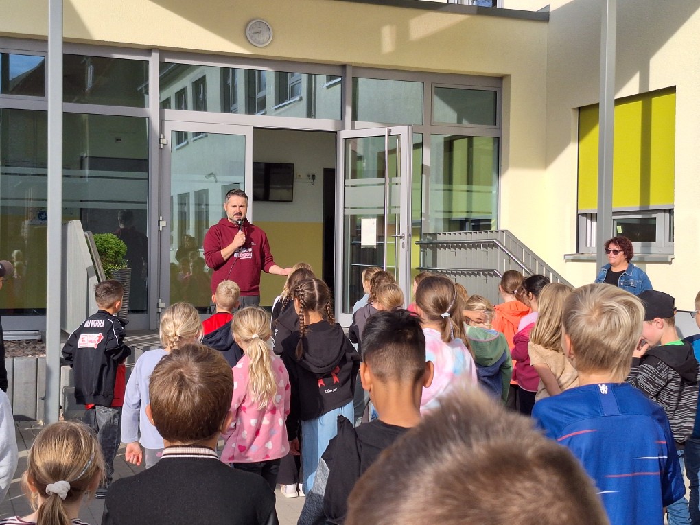 Auch Herr Wohlfahrt vom Schulförderverein kam zu den Kindern in die Grundschule. Er ist nicht irgendein Mitglied, sondern seit sehr vielen Jahren war er der Vereinsvorsitzende im Vorstand.