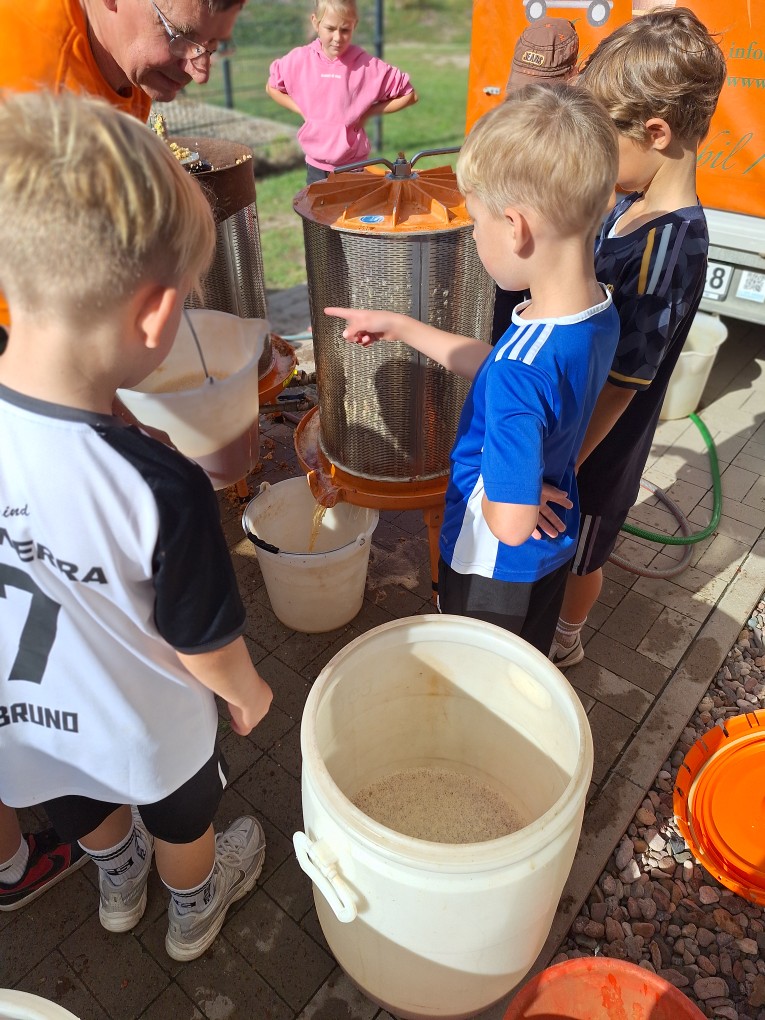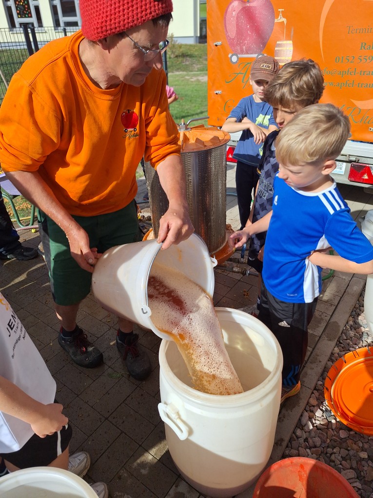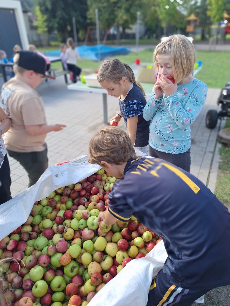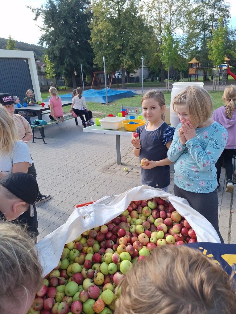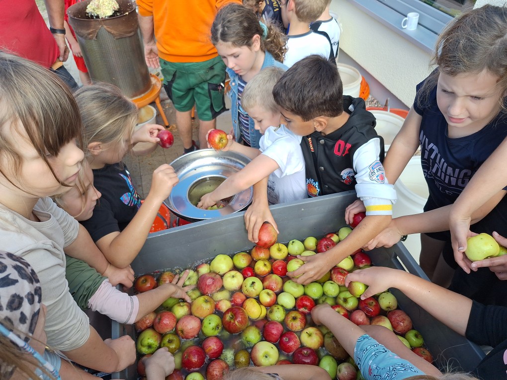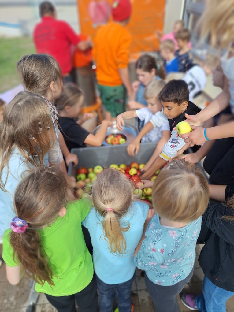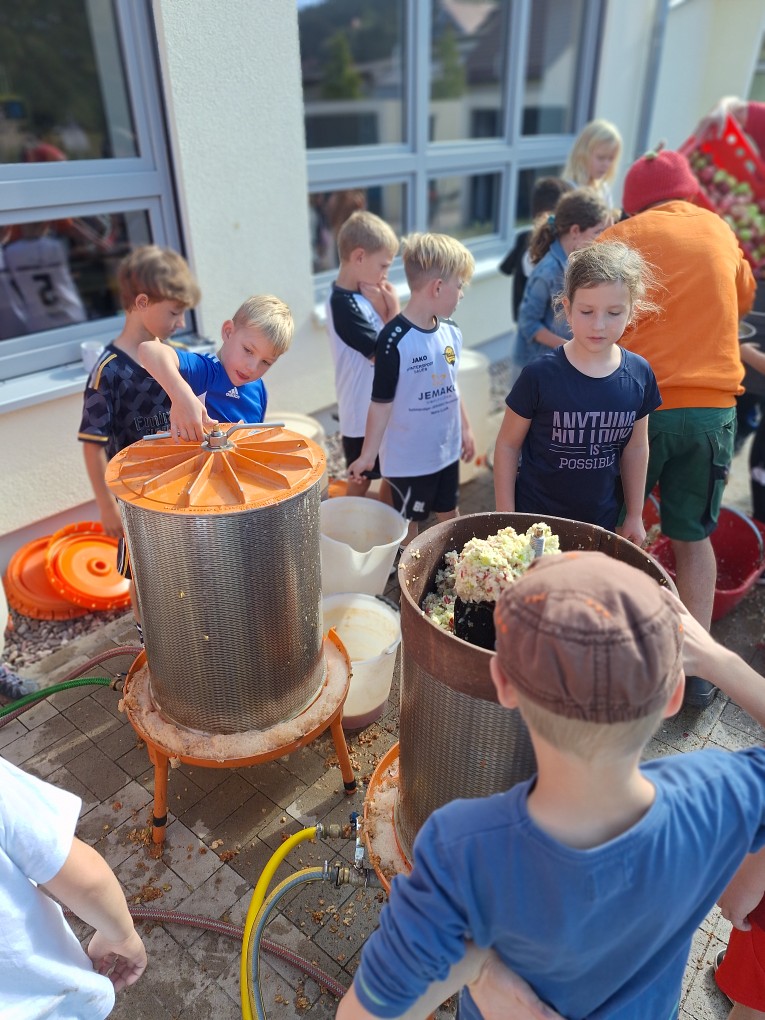 In diesem Jahr kombinierte man das. Einen halben Schultag beschäftigten sich die Kids mit dem „Apfel“. An vielen Stationen wurde Wissenswertes erarbeitet. Höhepunkt des Ganzen war, dass man mit Herrn Linse selbst Äpfel pressen konnte. Das erwies sich natürlich als ein großes Highlight und alle waren emsig dabei. Am Ende des Tages wurde rund 1 Tonne Äpfel gepresst. Der Saft wird zum Kieselbacher Weihnachtsmarkt angeboten. Von Herrn Linse konnte man außerdem noch so einiges über Streuobstwiesen, Apfelsorten usw. erfahren. Für die Kids ein unvergessliches Erlebnis.