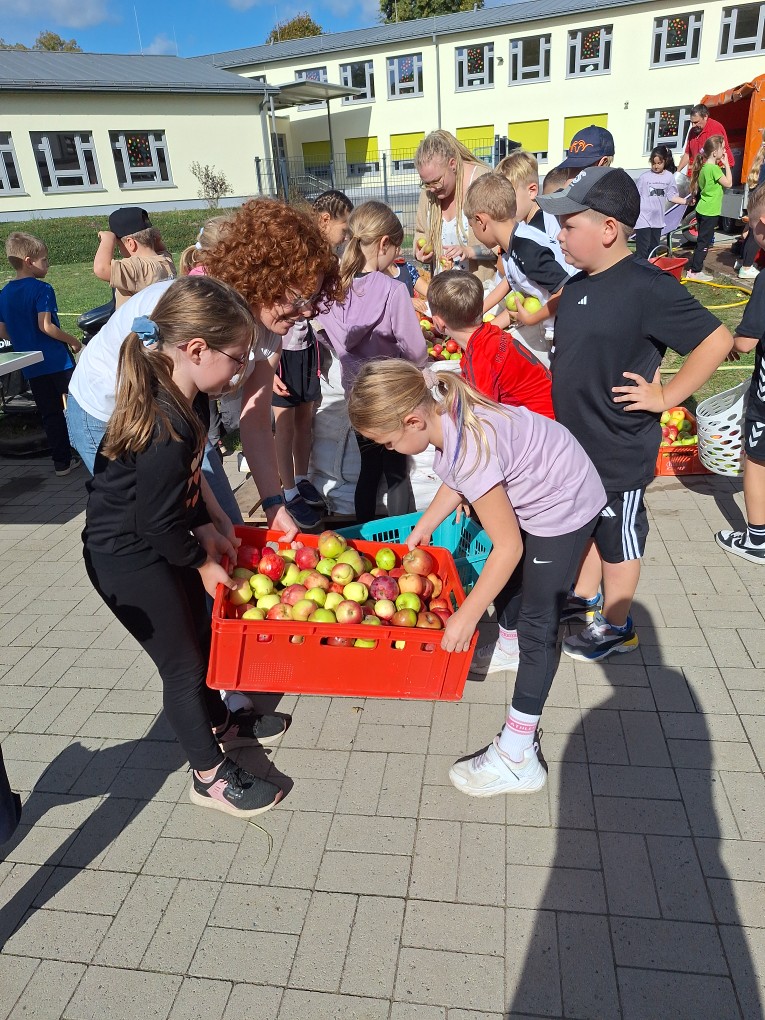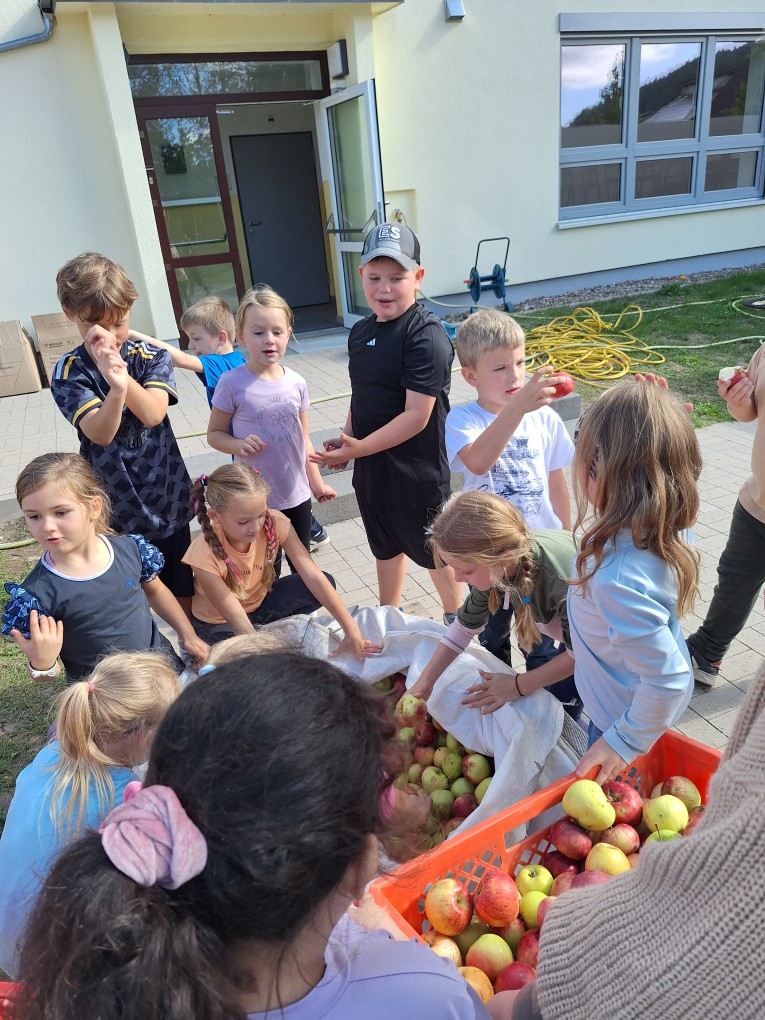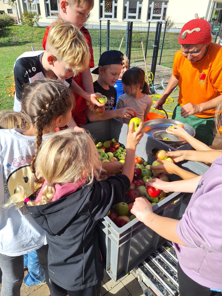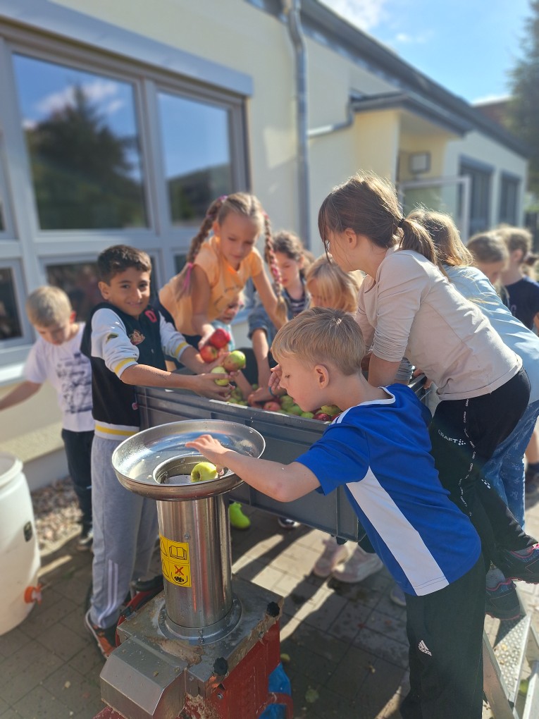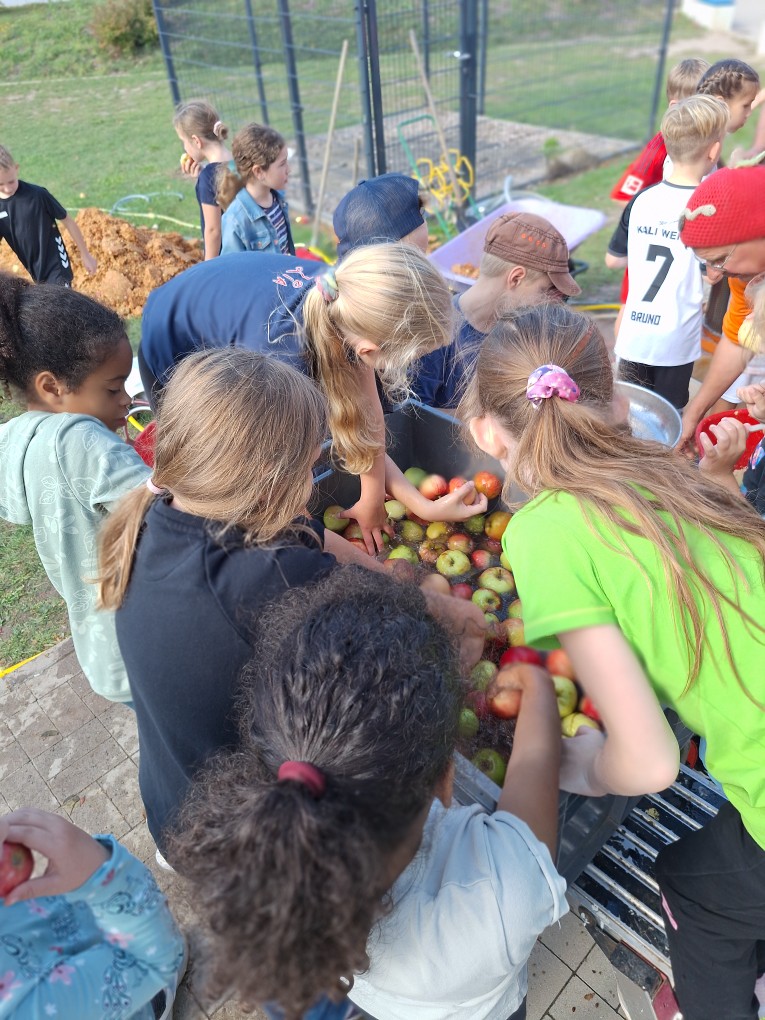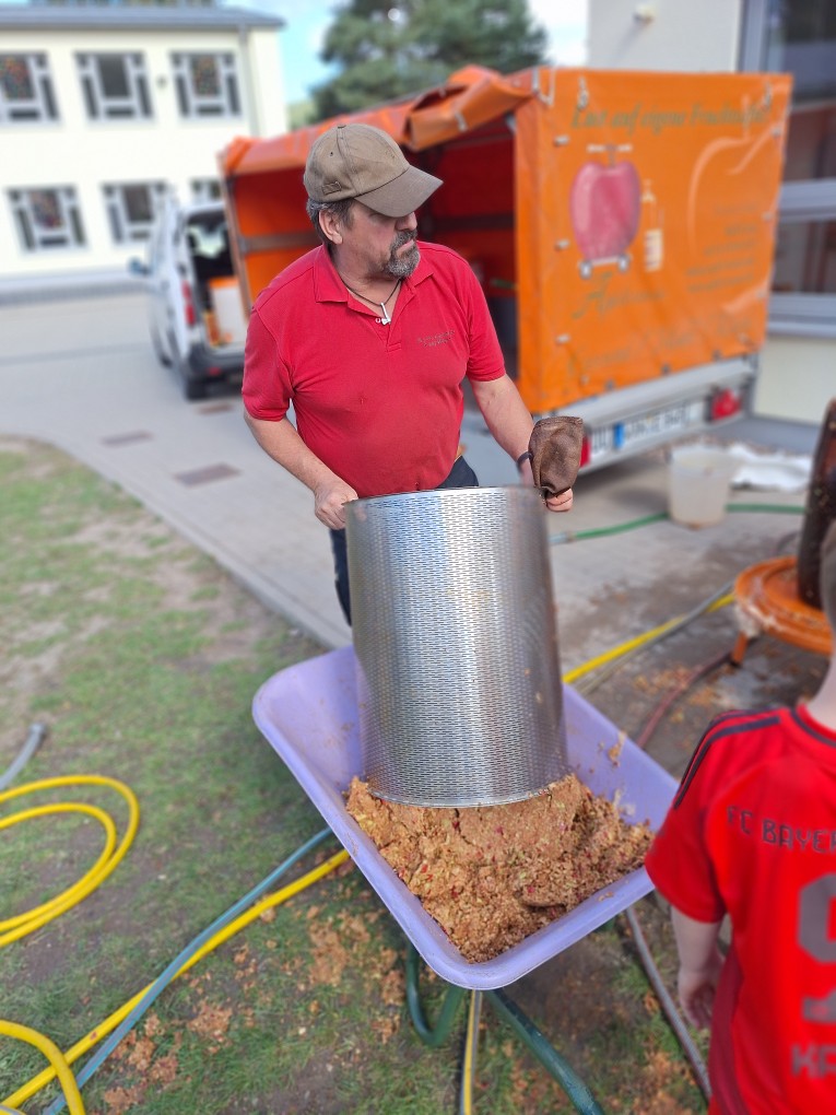 In diesem Jahr kombinierte man das. Einen halben Schultag beschäftigten sich die Kids mit dem „Apfel“. An vielen Stationen wurde Wissenswertes erarbeitet. Höhepunkt des Ganzen war, dass man mit Herrn Linse selbst Äpfel pressen konnte. Das erwies sich natürlich als ein großes Highlight und alle waren emsig dabei. Am Ende des Tages wurde rund 1 Tonne Äpfel gepresst. Der Saft wird zum Kieselbacher Weihnachtsmarkt angeboten. Von Herrn Linse konnte man außerdem noch so einiges über Streuobstwiesen, Apfelsorten usw. erfahren. Für die Kids ein unvergessliches Erlebnis.