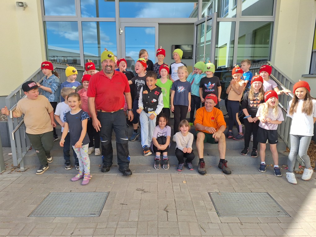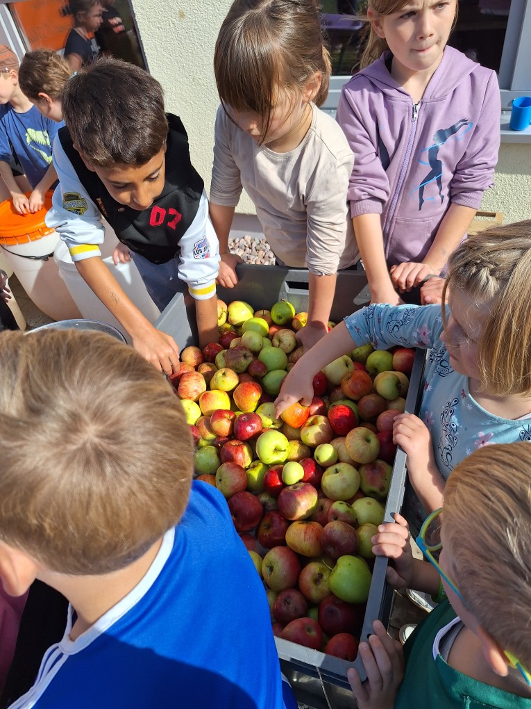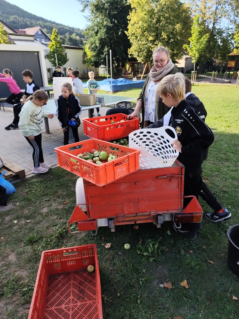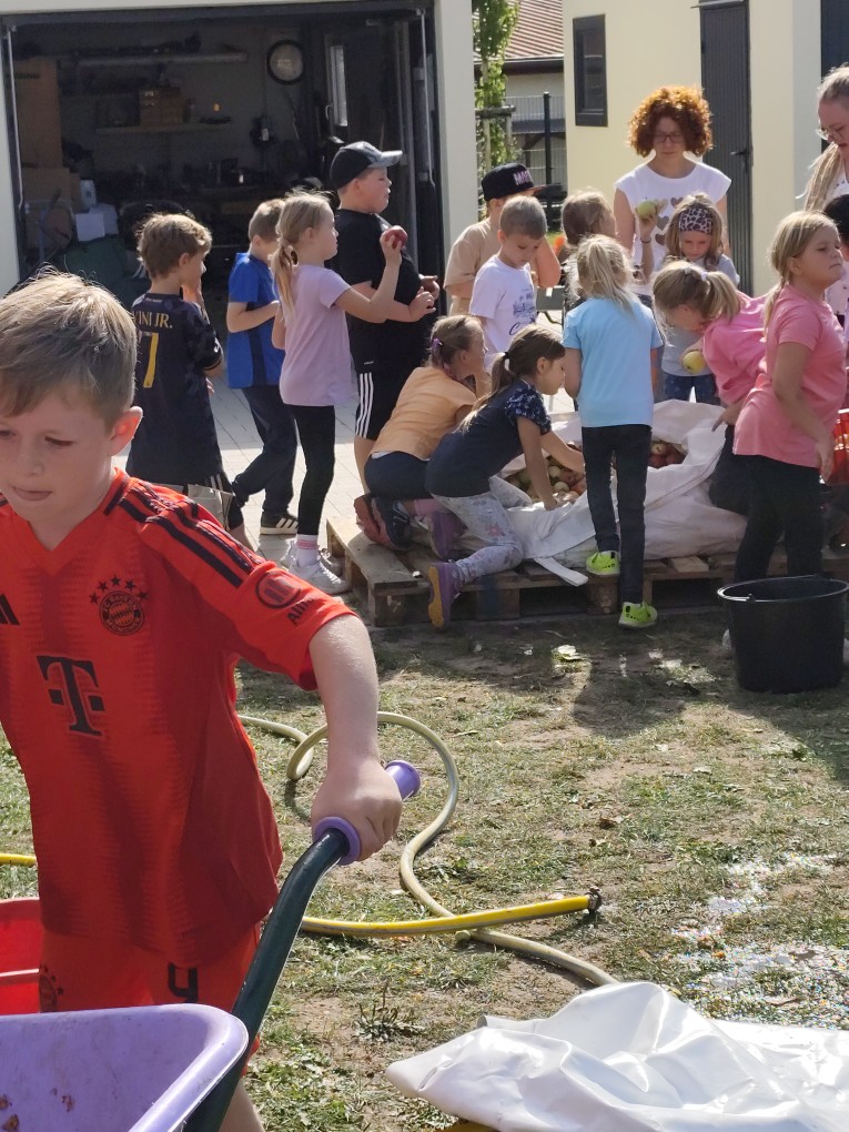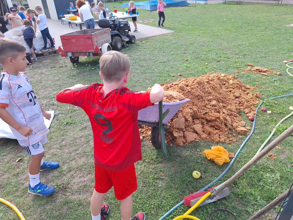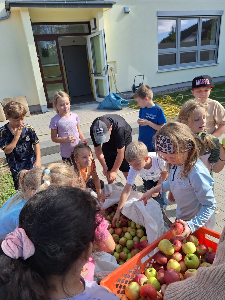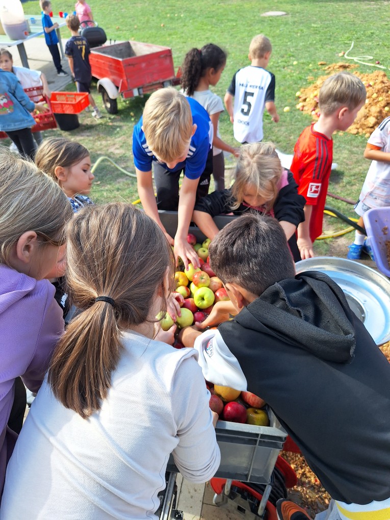 In diesem Jahr kombinierte man das. Einen halben Schultag beschäftigten sich die Kids mit dem „Apfel“. An vielen Stationen wurde Wissenswertes erarbeitet. Höhepunkt des Ganzen war, dass man mit Herrn Linse selbst Äpfel pressen konnte. Das erwies sich natürlich als ein großes Highlight und alle waren emsig dabei. Am Ende des Tages wurde rund 1 Tonne Äpfel gepresst. Der Saft wird zum Kieselbacher Weihnachtsmarkt angeboten. Von Herrn Linse konnte man außerdem noch so einiges über Streuobstwiesen, Apfelsorten usw. erfahren. Für die Kids ein unvergessliches Erlebnis.